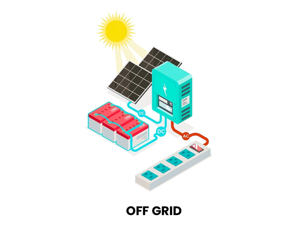 OFF-GRID SOLAR SYSTEM An off-grid solar system operates completely independent of the electricity grid. It uses solar panels to generate power, stores excess energy in a battery bank for later use, and often includes a backup generator for extended cloudy periods when solar production is limited