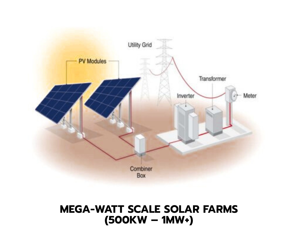MEGA-WATT SCALE SOLAR FARMS For large industries and utility-scale applications, our MW-scale solutions deliver transformative energy infrastructure. These custom-engineered solar farms feature industrial-grade components, tracking systems, and substation-compatible equipment