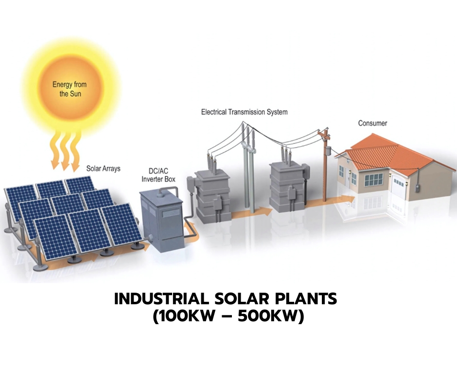 INDUSTRIAL SOLAR PLANTS Designed for manufacturing units, agro-processing facilities, and medium industries, our 100kW-500kW solar plants combine robust 3-phase technology with optional battery storage. These systems effectively manage peak load demands, reduce demand charges, and provide 50-70% energy cost savings.