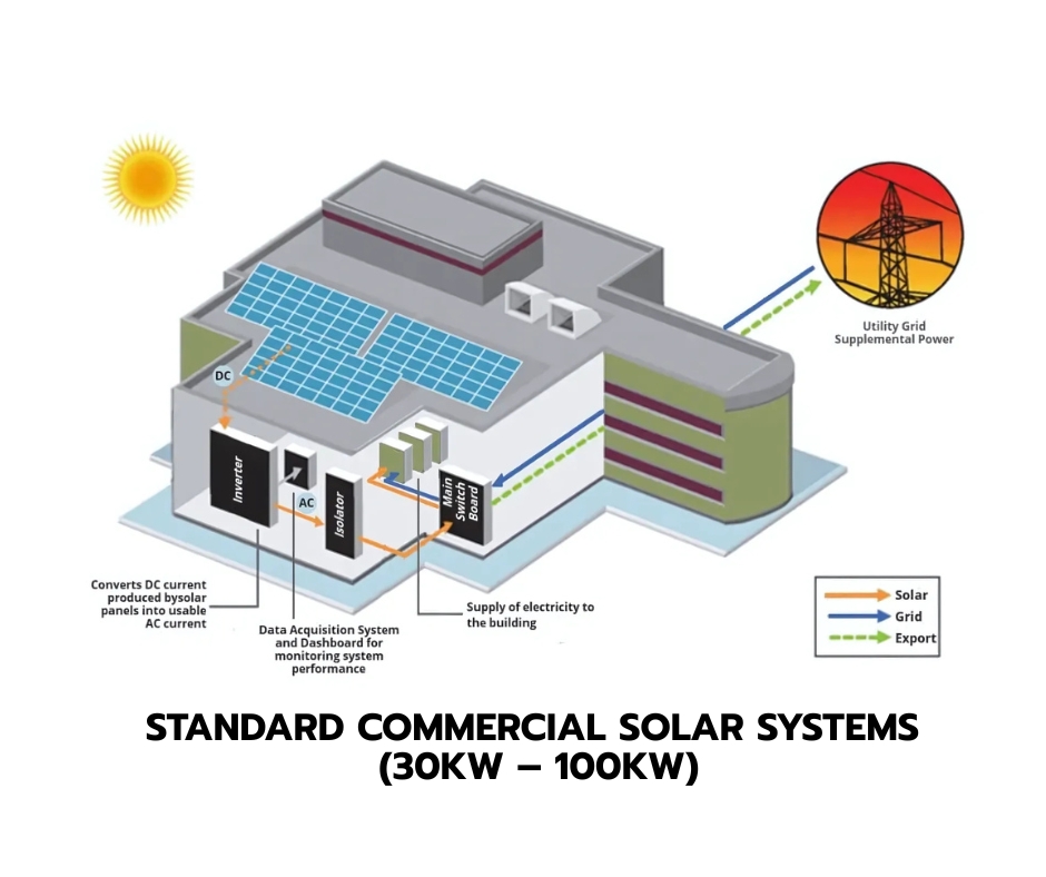 STANDARD COMMERCIAL SOLAR SYSTEM An on-grid solar system also called grid-tied connects directly to your local electricity grid. It uses solar panels to power your home during the day, while any excess energy is sent back to the grid often earning you credits through net metering. At night or on cloudy days, you automatically draw power from the grid.